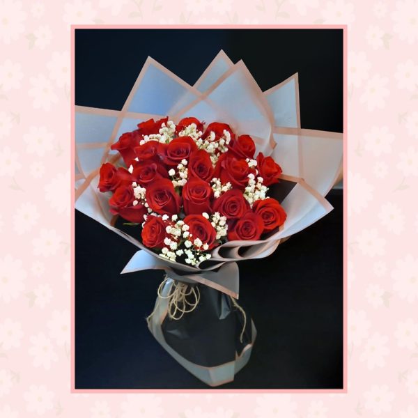 + Free ShippingStanding Bouquet 22 roses with gypsophilla elegantly wrapped and with rope ribbon