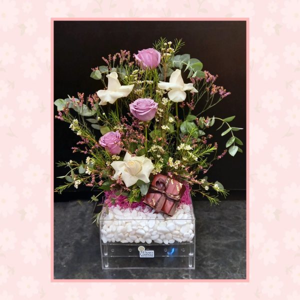 Flowers with Acrylic Stand with white Stones & Mix Flowers Arrangements.